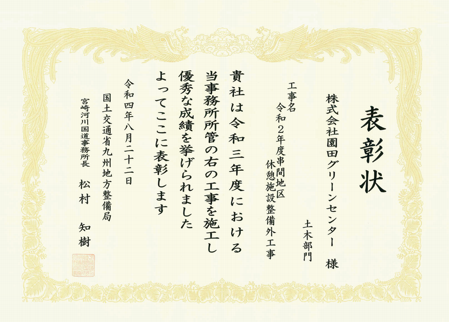 | 令和2年 | 国交省 令和2年度 宮崎管内交通安全施設整備工事 国交省 串間地区休憩施設整備外工事 北諸農林 (担手支援)高才第1地区 4工区 都城市 金御岳公園線道路災害復旧工事 |
