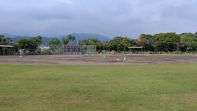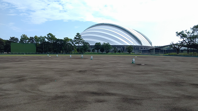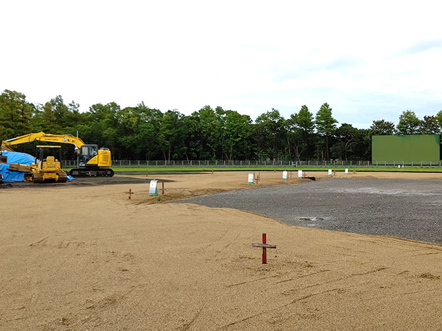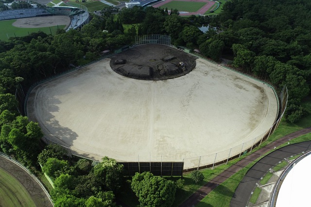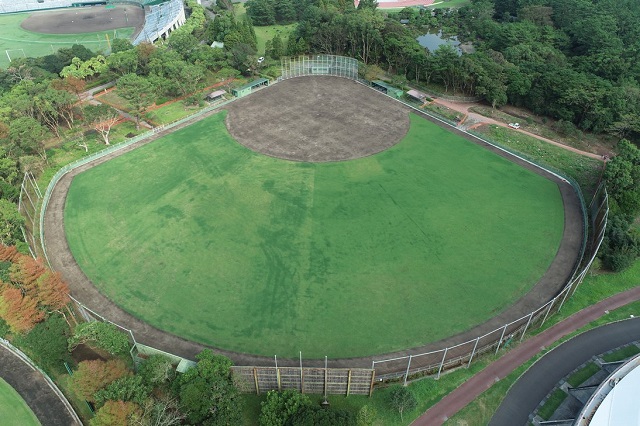 ひなた宮崎県総合運動公園内にある軟式野球場Aの改修工事です。同じ工事を担当する2社と協力し、当社は主に外野グラウンドの芝生舗装と内野グラウンドの修繕等を行いました。