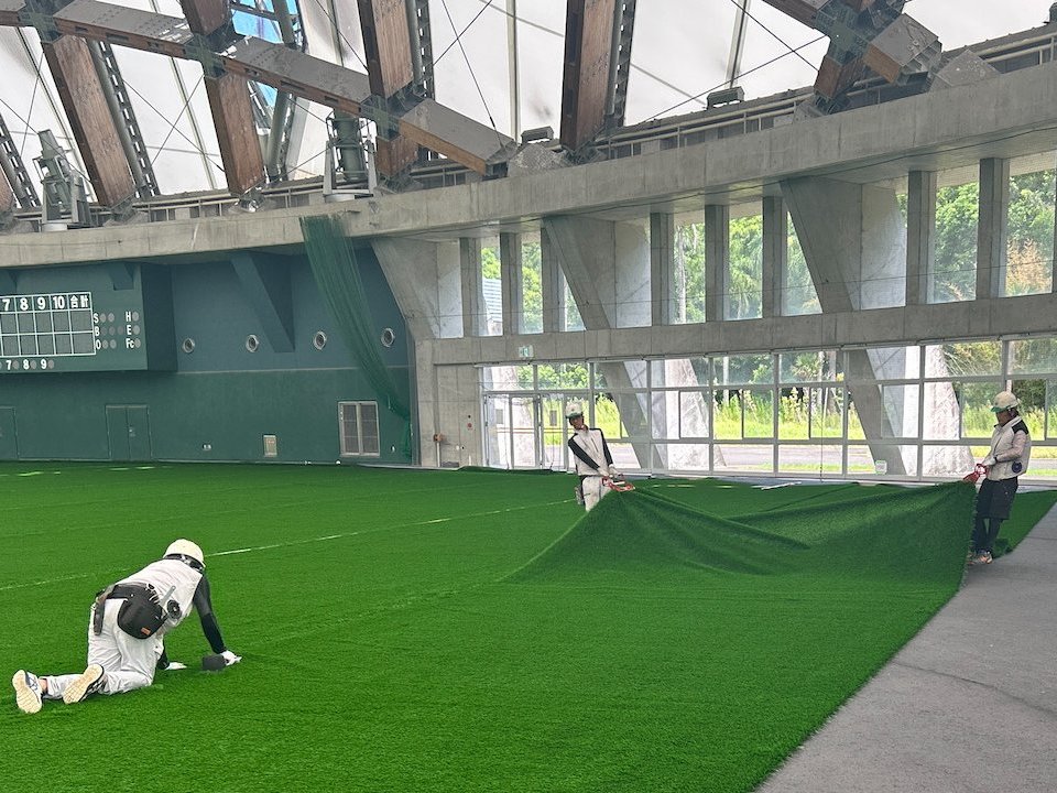 ひなた宮崎県総合運動公園内にある「木の花(このはな)ドーム」に人工芝を張る工事です。