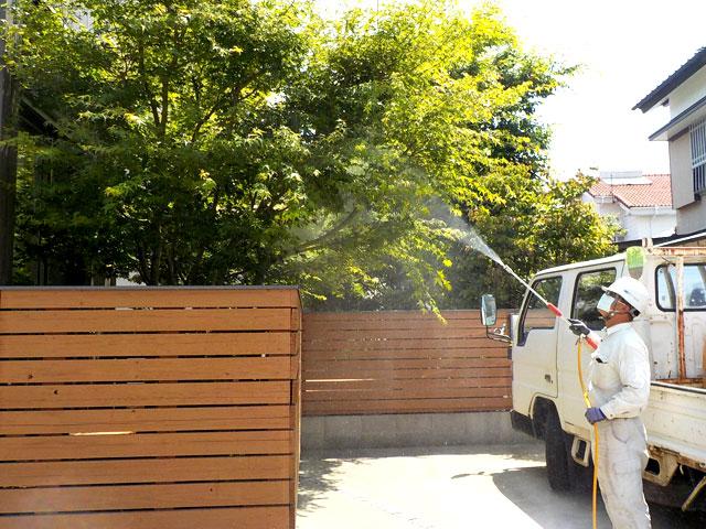 病害虫の発生時期に合わせて、薬剤を散布することで庭木を守ります。薬剤の飛散が心配という方は粉剤による方法もあります。