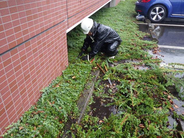 宮崎市内では、主にマンションや病院の管理を行っています。人通りの多い場所では特に安全に配慮して作業を行っています。